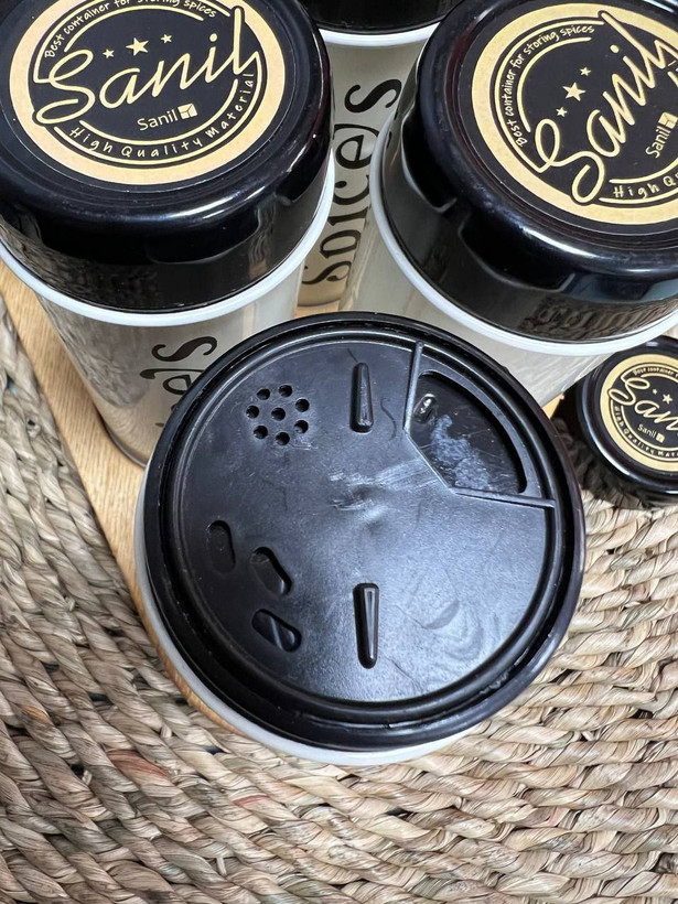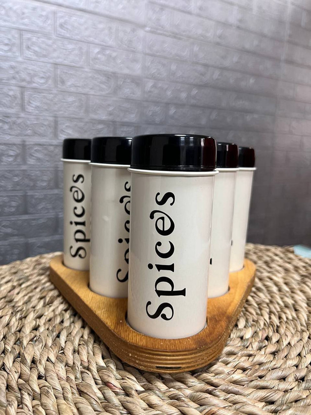 ✔️جا ادویه مثلثی فلزی 6 تایی با استند چوبی درب دوم چند حالته برای پاشیدن ادویه