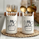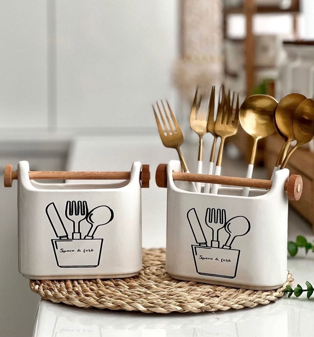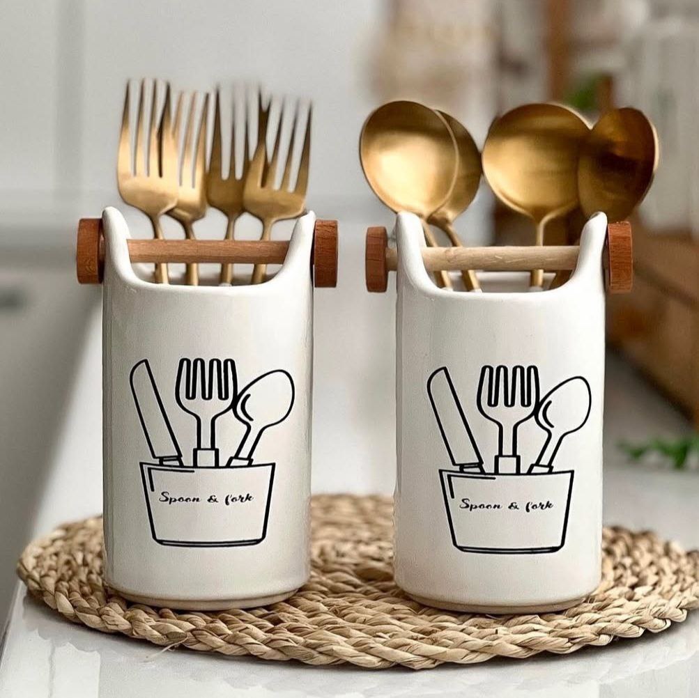 ✔️جا قاشقی رومیزی ✔️بدنه از جنس سرامیک ✔️به شکل استوانه و بیضی ✔️دارای دسته چوبی ✔️به رنگ سفید طرح قاشق، چنگال و کارد ✔️مناسب برای نگهداری قاشق و چنگال، کفگیر و ملاقه